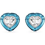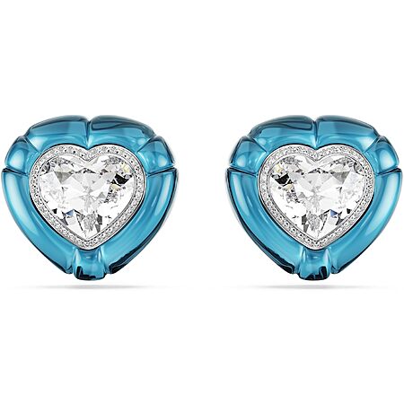 - Each cushioned blue heart features a clear heart-shaped crystal, surrounded by clear pavé in a rhodium plated frame