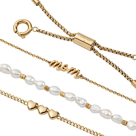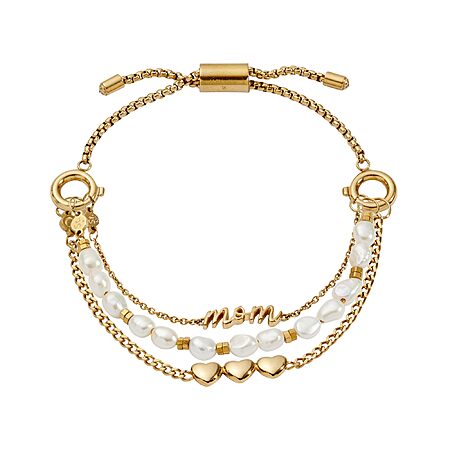 Features:- INTERCHANGEABLE STRANDS: Features three distinct strands—a "Mom" nameplate, a pearl strand, and a dimensional heart charm—designed to mix, match, and personalize within the Stranded Collection.