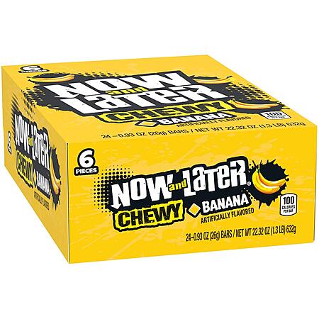 Amazon [amazon.com] has 24-Pack 0.93-Oz Now and Later Chewy Candy (Banana) on sale for $9.49 - 5% off when you checkout via Subscribe & Save = $9.02. Shipping is free w/ Prime or on orders $35+.
