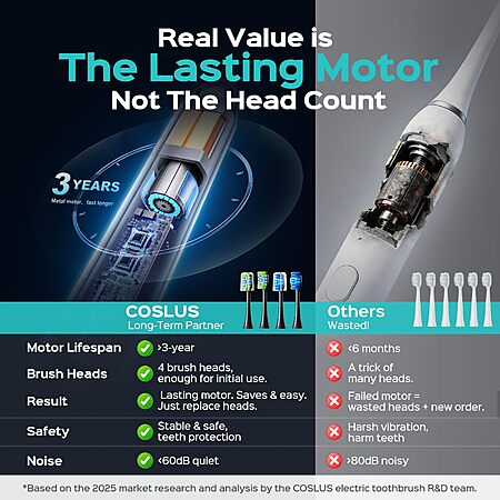 Model: COSLUS Sonic Electric Toothbrush for Adults: 3 Intensities & 5 Modes Gum-Friendly for Deep Cleaning & Whitening - 2 Types of Heads for Family, Sensitive Teeth, Braces, Travel & Home Use, Black