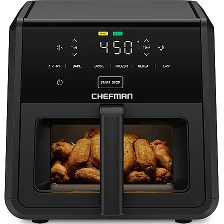 Air fry your favorite extra-crispy meals like chicken tenders, French fries, and onion rings with the Chefman TurboFry 9-Quart Air Fryer! With high-heat air frying up to 450°F and a rapid-speed DC motor, you can cook up to 40% faster than other conventional Chefman air fryers. Prepare your meals in next to no time; with six versatile cooking functions and precision fan speeds, you can bake, air fry, broil, reheat, dehydrate, or cook foods from frozen without breaking a sweat. Intuitive digital touch controls make setting up your cooking as easy as possible. A spacious 9-quart capacity is built for big-batch cooking, feeding 4 to 7 people with ease. The nonstick basket features an easy-view window to keep an eye on your fries without having to open the basket, and the matte-black finish looks stylish in any kitchen décor. Air fry faster than ever and enjoy a delicious golden-brown crunch for every meal with the Chefman TurboFry Air Fryer. cETL approved with advanced safety technology for long-lasting durability and a 1-year assurance provided by Chefman. 1750W/120V – RJ38-9TW-WM