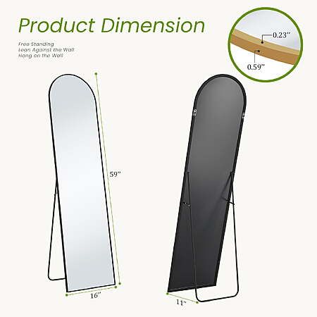 | Product Description: | This full-length mirror is a versatile and practical addition to any room in your home. Its sleek and timeless design effortlessly complements any decor style, adding a touch of elegance to your space. The large reflective surface allows you to check your outfit from head to toe, making it perfect for dressing rooms, bedrooms, or entryways. The sturdy construction ensures durability and stability, while the compact size makes it easy to move around as needed. Embrace the functionality and style of this full-length mirror, providing convenience and a touch of sophistication to your home decor. 1. Versatile & Practical: The CONCETTA Arched Full Length Mirror is a versatile and practical addition that can be placed in any room of your home. Its sleek design and timeless appeal make it a perfect fit for bedrooms, living rooms, hallways, and more. This mirror is not only functional but also adds a touch of elegance to any space. 2. Sleek Design: The black finish and arched top of the mirror lend a sleek and timeless design that effortlessly complements any decor style. Whether your home has a modern, traditional, or eclectic interior, this mirror will enhance the overall aesthetic with its elegant and sophisticated look. 3. Large Reflective Surface: With a large reflective surface measuring 59"x16", the CONCETTA Arched Full Length Mirror provides a full view of your outfit from head to toe. This feature is not only practical for checking your appearance before heading out but also adds functionality to your space by serving as a full-length mirror. 4. Durability & Stability: Built with sturdy materials, this mirror is constructed to last. The solid construction ensures durability and stability, providing you with a reliable and long-lasting mirror that will stand the test of time. You can use this mirror with confidence, knowing that it is well-made and resilient. 5. Available in Various Size Options: The CONCETTA Full Length Mirror is offered in a range of size options, allowing you to choose the perfect mirror to fit your space and preferences. Whether you opt for a larger size for a bold statement piece or a smaller size for a more subtle addition, you can select the size that best suits your needs. This versatility ensures that you can find the ideal mirror to complement any room in your home. Brand: CONCETTA Shape: Arched Material: Aluminum Alloy & Shatter-proof Glass Style: Modern Mounting Type: Leaning, Freestanding, Hanging Room Type: Closet, Vanity Room, Living Room, Bedroom, Bathroom Assembly Required: No Brand: CONCETTA Shape: Arched Material: Aluminum Alloy & Shatter-proof Glass Style: Modern Mounting Type: Leaning, Freestanding, Hanging Room Type: Closet, Vanity Room, Living Room, Bedroom, Bathroom Assembly Required: No |