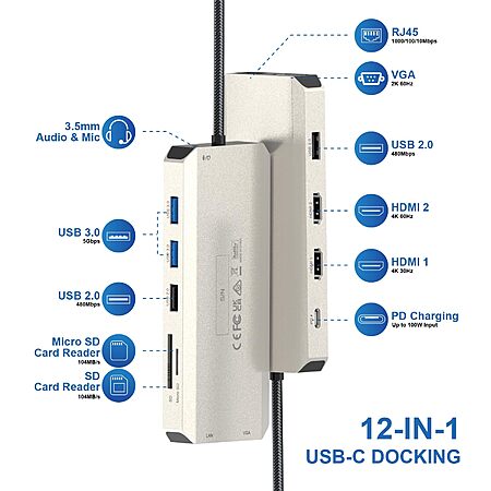 12-in-1 USB C Docking Station, WAVLINK Triple Display Type-C Adapter with 2X 4K HDMI and 1x 2K VGA Port $34.99