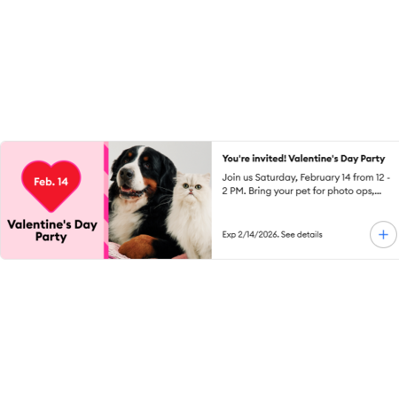 PetSmart's Valentine event is available in PetSmart U.S., Canada, and Puerto Rico stores on 2/14/26. Free items and/or gifts are available while supplies last and distributed on a first-come, first-served basis. Event availability by location is subject to change without notice. Pets are welcome in accordance with our pet policy found at petsmart.com/help/. Photos may be taken on personal devices or on store devices where available, which will then be delivered via email.