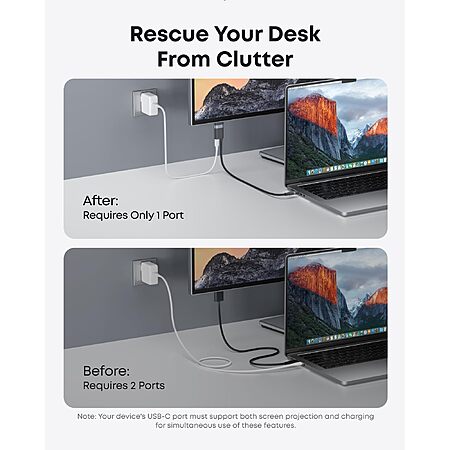One Port for Power and Display: Keep your devices powered up while streaming video in ultra-high 4K definition, all from one convenient USB-C port. (Note: To charge while projecting, an additional charging cable and wall charger are required.)