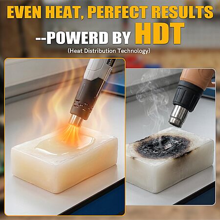 • 【Even Heat with HDT, No Hot Spots】Experience flawless heating with exclusive Heat Distribution Technology (HDT), which evenly spreads heat to eliminate damaging hot spots. Easily switch between 572°F for delicate crafts and 1022°F for tough jobs. The 380W motor (stronger than 300W/350W models) delivers fast, efficient performance for shrink tubing, vinyl wrap, and DIY projects