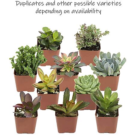 • This succulent assortment changes seasonally and features a mix of Crassula, Echeveria, Sedum, Graptopetalum, Portulacaria, Cotyledon, and more in pairs of 2.