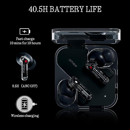 Long Playtime, Fast Charging: Ear supports up to 2.5W wireless charging. Power-up on-the-go with reverse charge on compatible devices, like Phone (2). Powered to go further, Ear lasts 25% longer than Ear (2) on a single charge. Or top-up in the case and use consistently for over 40.5 hours (ANC turned off). For speedy power-ups, Ear can Fast Charge for 10 minutes and deliver 10 hours of playback (with ANC turned off)