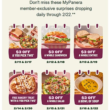 Purchase required. Must be a MyPanera member to be eligible for this offer. On February 13/19, 2026 only, get $3 off one whole entrée at participating US cafes only. Offer will be added to MyPanera wallet as reward, but reward will not be automatically applied and must be selected when ordering. Limit one use. If order contains multiple eligible whole entrees, discount applies to lowest priced whole entrée. Upcharges due to customer modifications will still apply and will not be discounted. Offer not valid on You Pick Two, Kids Menu, Family Feasts, Salad Stuffers, catering or third-party site orders. Delivery order minimum $8-10 applies, exclusive of any taxes/fees/charges (varies by location). Menu prices for delivery are higher and fees apply. Not valid with any other coupon or offer. Offer may expire or be terminated by Panera without notice due to error, fraud, computer or typographical error, electronic or technical malfunctions, or other unusual or unexpected circumstances. While supplies last. This offer is exclusive to you and your MyPanera account and cannot be reproduced, transferred, or used by anyone else. Only one MyPanera account is permitted per person. Signing up for more than one MyPanera account per person constitutes fraud and Panera will cancel all accounts and revoke all rewards. Other restrictions may apply.Visit https://www.panerabread