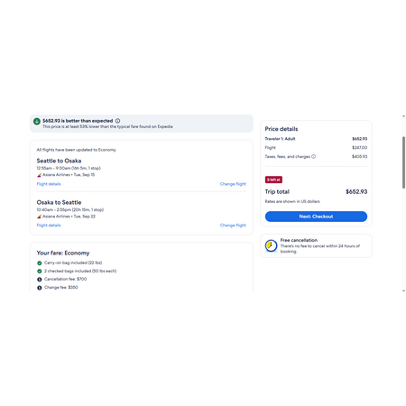 Asiana Airlines via Expedia have round trip airfares travelling from Seattle (SEA) to Osaka Japan (KIX) for $653 making 1 stop in Seoul South Korea both ways for 1-9 hours.. This promotional airfare is in economy and includes a personal item, a carry-on bag and 2 free checked bags.