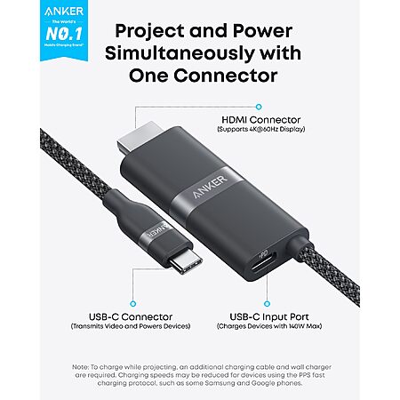 Model: Anker Nano USB C to HDMI Cable Adapter with 140W PD Fast Charging Port,4K@60Hz HDMI to USB C Cord,Sustainable with Advanced Shielding,Thunderbolt 5/4/3 Compatible,for MacBook,iPhone,HD TV(6FT,Black)