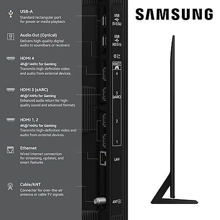 | Product Description: | Discover a new level of visual and auditory brilliance with our next level smart TV. Powered by Pantone certified color accuracy , witness over one billion authentic hues burst forth in beautiful detail. Quantum HDR takes things further, elevating contrast for lifelike imagery. Add to that our advanced 3D audio system syncing flawlessly with on screen motion, all intelligently powered by Samsung Vision AI. And rest assured, Knox keeps your private info safe and secure. Samsung is ranked No. 1 TV brand globally for 19 years* *Source -- Omdia, Feb-2025. Results are not an endorsement of Samsung. Any reliance on these results is at the third party’s own risk. NQ4 AI Gen2 Processor-Experience the power of AI in your 4K TV. Powered by 20 neural networks, it makes all the movies, TV shows, video games and sports and you love to watch even better, by upscaling them to impressively beautiful 4K¹, even if the source content is lower-resolution. The processor also optimizes sound, so no matter what you watch, you'll get a superb overall viewing experience. Quantum Matrix Technology Slim-Make every moment come to life with this innovative lighting technology that precisely controls our proprietary Mini LEDs to unlock details. Every scene is delivered with sharp and accurate contrast. Elevate your viewing experience whether you're watching content with details hidden in dark shadows or bold pops of bright highlights. 4K AI Upscaling-Enjoy watching shows, movies, games and more in 4K resolution. Our advanced AI processor upscales your content up to 4K using 20 AI neural networks, allowing you to experience sharp and smooth picture quality, no matter what you watch.² Endless Free Content / One UI Tizen-Watch 2,700+ free channels, including over 400 premium Samsung TV Plus channels and free streaming apps on a user friendly smart TV platform that you can personalize. Stay updated with live national and local news, sports, movies, music, kids' shows, K-content and reality TV-all for free. Plus, play your games, follow recipes or binge-watch shows from your favorite streaming services with just a few clicks. Get 7 years of automatic OS updates so your TV stays up to date.³ Neo Quantum HDR-Elevate your entertainment with more clarity, and see every moment come to life in your favorite shows and movies. Reveal hidden details with bold brights and inky blacks in each scene. The NQ4 AI Gen2 processor analyzes each scene and dynamically enhances brightness for deeper contrast, revealing hidden details for a more cinematic and immersive viewing experience.⁴ In HDR10+ content, each scene is dynamically tone mapped for optimal contrast and enhanced HDR performance. Motion Xcelerator 144Hz-Play your favorite video games and enjoy sports with exceptional motion clarity with minimal lag or blur. You'll get consistently crisp visuals and ultra-smooth performance at top speeds, so your picture stays seamless throughout all the non stop action. With dynamic refresh technology, it supports VRR games at up to 4K 144Hz, providing incredible performance for your favorite games.⁵ Auto HDR Remastering-Get the bold, dramatic picture of High Dynamic Range (HDR) even when watching Standard Dynamic Range (SDR) content. Auto HDR Remastering intelligently transforms SDR content to HDR like quality with brighter highlights, more vibrant colors, and clearer details for dazzling picture using deep learning algorithms. SDR content is transformed by adjusting brightness, contrast, and color for HDR-like quality. Freesync Premium Pro-Smooth motion and peak performance combine together for an exceptional gaming experience on your Samsung TV. Built on AMD FreeSync ™core technology to reduce stutter and screen tearing, FreeSync Premium Pro provides a true HDR gaming experience-all while maintaining low latency for effortlessly smooth gameplay and responsive performance.⁶ Object Tracking Sound Lite and Q-Symphony-Feel like you're in the middle of the action with sound that follows objects on screen. Featuring a virtual top channel, every sound is placed in space and moves with the action, enhancing your sense of immersion. Whether it's a car chase, an intense shootout, or a romantic dinner conversation, you’ll feel like you're right in the middle of it all. When paired with a Samsung soundbar⁷, sound plays through all speakers without muting the TV, creating a more robust and nuanced audio experience. Live Translate-Enjoy content in your own language. The AI processor identifies the language of your content and instantly translates it, creating subtitles in your preferred language. Watch foreign TV shows, series and movies without getting lost in translation.⁸ ¹Utilizes AI Based formulas to upscale to 4K resolution. Resulting picture may vary based on source content. ²Utilizes AI Based formulas to upscale to 4K resolution. Resulting picture may vary based on source content. ³Samsung Account required for network based smart services, including streaming apps and other smart features. Computer, mobile or other device may be necessary to create/log in to Samsung Account (free to download and create). Without Account log in, only external device connections (e.g., via HDMI) and terrestrial/over the air TV (only for TVs with tuners) available. Channels may vary by location and are subject to change. UI is subject to change without prior notice. Automatic OS updates based on model year; requires Internet connection. ⁴Compared to SDR (Standard Dynamic Range) ⁵4K 144Hz is only available with PC connected games that support such specifications (PC graphic card required). Performance may vary. ⁶Only available with PC connected games that support such specifications (PC graphic card required). Performance may vary. ⁷Soundbar sold separately ⁸Works with antenna broadcast only. Available languages vary and may require download. Translation accuracy not guaranteed. |