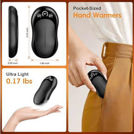 - 【5-Second Instant Heat & 3-Temp Settings】Get immediate relief from the cold! Our electric hand warmers reach your desired temperature in just 5 seconds. With three adjustable heat levels (up to 131°F/55°C), you can customize your comfort for any scenario, from a chilly morning commute to a freezing outdoor sporting event. These rechargeable hand warmers provide consistent, reliable warmth.