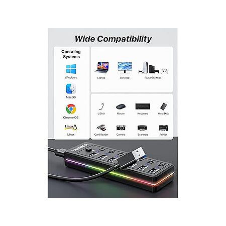 Woot! has 3.3ft ZIUMIER RGB USB3.0 Hub 7 Port,Independent Switch Control on sale for $10.99. Shipping is free w/ Prime. Otherwise shipping is $6.