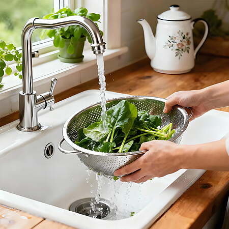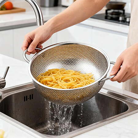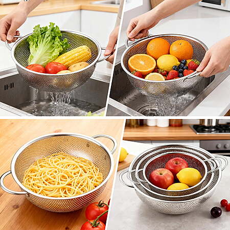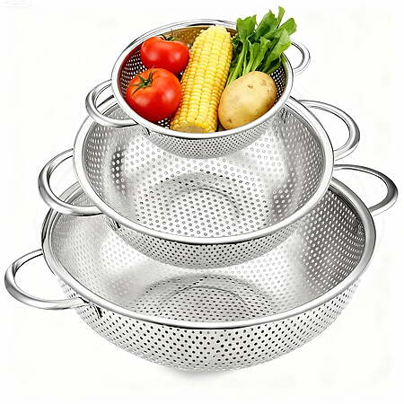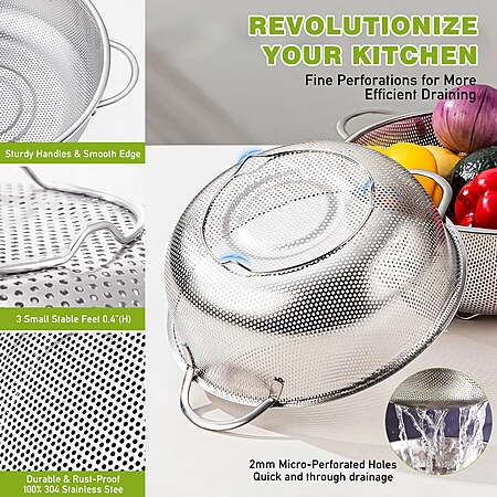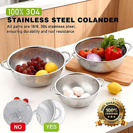 | Product Description: | Whether you’re looking for a sturdy and durable colander, which can helpe you prepare food faster, healthier and cleaner? AOKIWO Stainless Steel Colander Set is made of high qulity stainless steel without any toxic materials leeching into your food, please rest assured it is safe and healthy for your daily use. The colander set is available in 3 size -1/3/5 quart, which will meet your different needs in kitchen. That is surprised they are sturdy but lightweight, please don't worry to spent too much strength using them. They will help you to prepare food faster, saving a few time on the cooking process. 3 Sizes Colanders Would Meet Your Different Needs Perfect Replacement of Your Old Heavy Colander Three Sizes - 1/3/5 Quart Easy Clean & Dishwasher Safe Sturdy & Lightweight Size/Dimension 1 Quart - Diameter 6.5 inch, High 2.5 inch 3 Quart - Diameter 8.8 inch, High 3.5 inch 5 Quart - Diameter 11 inch, High 4 inch USING INSTRUCTION 1. Please wash the colander set with warm soapy water before first using to wash off any residue left from the manufacturing process 2. Please clean and dry the colander set after using for your healthy daily use, Stored in dry place for its durability PREMIUM STAINLESS STEEL - AOKIWO 3-piece metal colander set is made entirely of food grade stainless steel, Non-toxic & Rust proof, Sturdy build construction will not bent, stretch or snag even under heavy foods, Stain, odor and heat resistant compared to plastic colander, Healthy and durable for everyday kitchen use PERFORATED HOLES - 2.5 mm holes covering its bottom and sides for quick and through drainage while prevent small foods falling through, No food particles will get stuck anywhere unlike Mesh, Smooth matte finish prevent tarnishing, Easy to clean and Dishwasher safe HEAVY HANDLES - D-shaped handles are solidly welded for easy lifting and transportation, Allow you to place this colander in a mixing bowl for draining, Also can be used as hooks for hanging during storage, which will help save space and declutter your kitchen counters 3 SMALL FEET - Triple 0.4-inch feet keep this colander steady and allow all water to drain away from your pasta or veggies when placed in the sink, Added height of the feet also improves sanitation when preparing or serving, Lightweight for easy to use and storage MULTIPURPOSE - 1-3-5 Quart is available in 3 sizes. , The colander set is great for washing, rinsing, draining, Perfectly used for pasta, spaghetti, vegetable, fruit, meat and seafood, Also can be used as fruit container and salad mixing bowl, it aslo can be used as a steamer for pot. |
