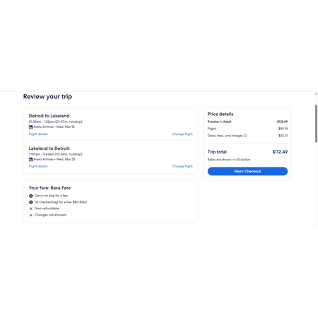 Avelo Airlines, an ultra low cost air carrier and Booking.com have round trip airfares travelling to and from Detroit (DTW) and Lakeland FL (LAL) for $113, nonstop. There is no seat selection and no carry-on bag allowance. You may bring a small personal item that fits under the seat in front of you. Additional fees for carry-on and checked bags, advanced seat selection and other optional services may apply.