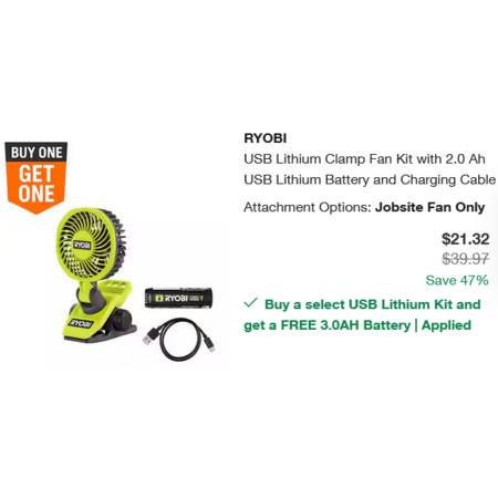 3. Either return or don't pickup the RYOBI USB Lithium 3.0 Ah Lithium-Ion Rechargeable Battery and you end up with the RYOBI USB Lithium Clamp Fan Kit with 2.0 Ah USB Lithium Battery and Charging Cable for $21.32.