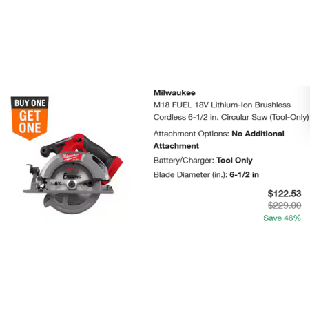 3. Either return or don't pickup the Milwaukee M18 18-Volt Lithium-Ion High Output Battery Pack 6.0Ah and you end up with the Milwaukee M18 FUEL 18V Lithium-Ion Brushless Cordless 6-1/2 in. Circular Saw (Tool-Only) for $122.53.