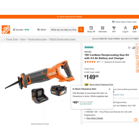 YMMV - Select Home Depot Stores: RIDGID 18V Cordless Reciprocating Saw Kit with 4.0 Ah Battery and Charger. In-Store Clearance $65.05