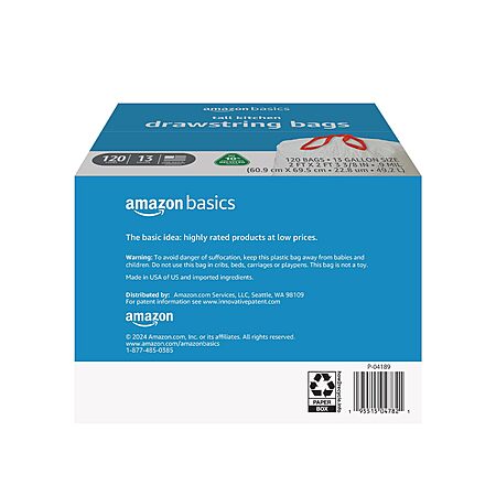 Model: Amazon Basics 13 Gallon Tall Kitchen Drawstring Trash Bags, Unscented, 10% Post Consumer Recycled, 120 Count