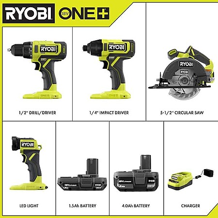 | Product Description: | RYOBI introduces the ONE+ 18V Cordless 4-Tool Combo Kit with 1.5 Ah Battery, 4.0 Ah Battery, Charger, and Diamond Grit Driving Set (12-Piece). The ONE+ Drill/Driver provides up to 515 in./lbs. of torque and features a 1/2 in. ratcheting metal chuck to match your drilling and driving needs. The ONE+ Impact Driver is able to drive long deck screws or large lag screws with ease by delivering 3,400 IPM along with 1800 in./lbs. of torque controlled by a variable-speed trigger that churns out 2,700 RPM. The ONE+ 5-1/2 in. Circular Saw has the ability to cut through 2-by material, with over 215 cuts per charge. The ONE+ LED Light also has 280 Lumens of light output and has a 130° pivoting head for adjustable light beam direction. The ONE+ 4.0 Ah and 1.5 Ah Batteries feature an integrated high visibility fuel gauge to monitor remaining runtime. The 18V Charger is compatible with RYOBI ONE+ Lithium-ion Batteries. Best of all, this kit is part of the RYOBI ONE+ System of over 300 Cordless Products that all work on the same battery platform. Backed by the RYOBI 3-Year Manufacturer's Warranty, the 18V ONE+ 4-Tool Combo Kit includes (1) PCL206 18V 1/2 in. Drill/Driver, (1) PCL235 18V 1/4 in. Impact Driver, (1) PCL500 5-1/2 in. Circular Saw, (1) PCL660 LED Light, 18T Carbide Blade, Hex Wrench, (1) 18V 4.0 Ah Lithium-ion Battery, (1) 18V 1.5 Ah Lithium-ion Battery, Charger, Tool Bag, 2 in. Diamond Grit Driving Set (12-Piece), and Operator’s Manuals. |