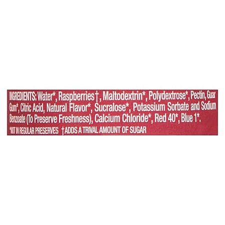 Water (Not in Regular Preserves), Raspberries (Adds a Trival Amount of Sugar), Maltodextrin (Not in Regular Preserves), Polydextrose (Not in Regular Preserves), Pectin, Guar Gum (Not in Regular Preserves), Citric Acid, Natural Flavor (Not in Regular Preserves), Sucralose (Not in Regular Preserves), Potassium Sorbate and Sodium Benzoate (to Preserve Freshness), Calcium Chloride (Not in Regular Preserves), Red 40 (Not in Regular Preserves), Blue 1