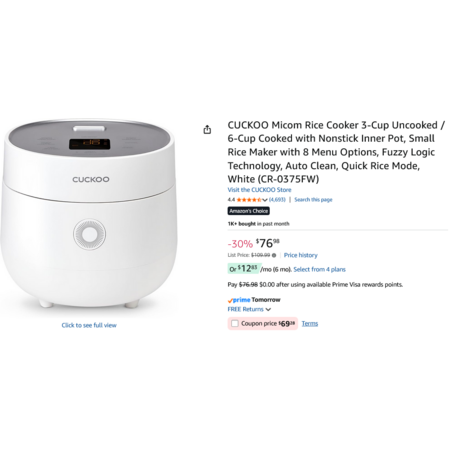 CUCKOO Micom Rice Cooker 3-Cup Uncooked / 6-Cup Cooked w/Nonstick Inner Pot, Fuzzy Logic Tech, White (CR-0375FW). YMMV - Coupon Price $69.28