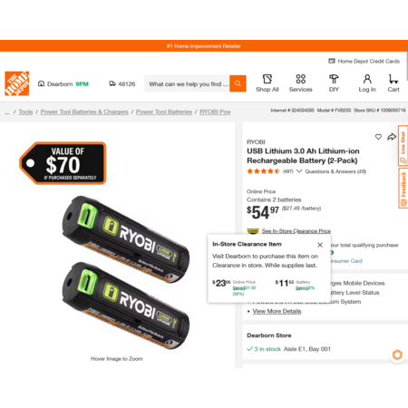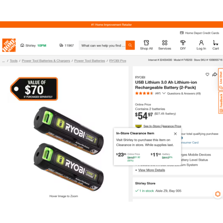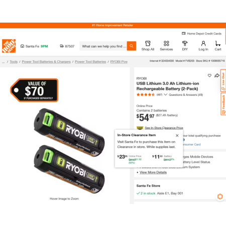 YMMV - Select Home Depot Stores: RYOBI USB Lithium 3.0 Ah Lithium-ion Rechargeable Battery (2-Pack). In-Store Clearance $23.05