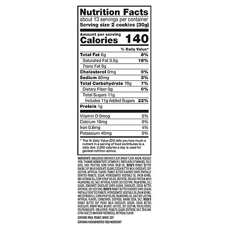 Unbleached Enriched Flour (Wheat Flour, Niacin, Reduced Iron, Thiamine Mononitrate [Vitamin B1], Riboflavin [Vitamin B2], Folic Acid), High Fructose Corn Syrup, Palm Oil, Reese'S Peanut Butter Baking Cup (Milk Chocolate [Sugar, Cocoa Butter, Milk, Chocolate, Soy Lecithin, Artificial Flavor], Peanut Butter Flavored Chips [Partially Defatted Peanuts, Sugar, Hydrogenated Vegetable Oil {Palm Kernel And Soybean Oil}, Corn Syrup Solids, Dextrose, Reduced Protein Whey, Palm Kernel Oil, Salt, Artificial Flavor, Soy Lecithin], Palm Kernel Oil), Sugar, Semisweet Chocolate Chips (Sugar, Chocolate, Cocoa Butter, Dextrose, Soy Lecithin), Reese'S Peanut Butter Flavored Chips (Sugar, Partially Defatted Peanuts, Hydrogenated Vegetable Oil [Palm Kernel And Soybean Oil], Corn Syrup Solids, Palm Kernel Oil, Salt, Soy Lecithin, Artificial Flavor), Cornstarch, Dextrose, Baking Soda, Salt, Reese'S Peanut Butter Cup Pieces (Milk Chocolate [Sugar, Cocoa Butter, Chocolate, Nonfat Milk, Milkfat, Lactose, Soy Lecithin, Polyglycerol Polyricinoleate - Emulsifier], Peanuts, Sugar, Dextrose, Salt, Tbhq And Citric Acid [To Maintain Freshness]), Artificial Flavor. Contains: Milk, Peanut, Wheat, Soy.