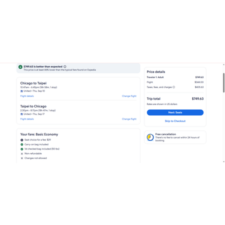 United Airlines and Expedia have round trip airfares travelling from Chicago (ORD) to Taipei Taiwan (TPE) for $750, making 1 stop both ways. These are basic economy fares that allow a personal item, a carry-on bag and 1 free checked bag. There is no seat selection and no change. If you are travelling with children on United, you will be seated together as per UA's policy.