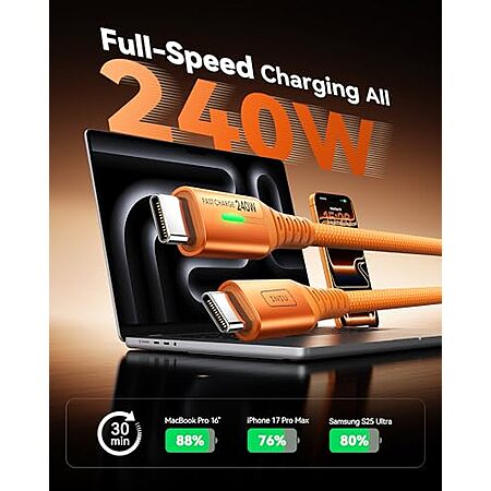[AC] $6.62 | INIU USB C to USB C Cable, 240W Fast Charging Type C Charger Cord [6.6ft+6.6ft Orange] at Amazon