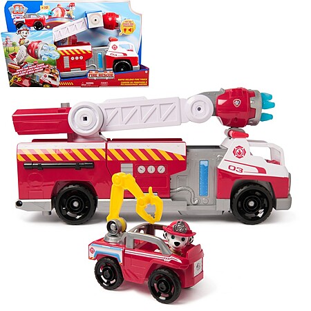 | Product Description: | Get ready for thrilling rescue missions with the PAW Patrol Fire Rescue Rapid Reload firetruck. This Patrol Fire Rescue toy is a hero's dream, featuring a Marshall fire truck, a massive 20-inch-long patrol firetruck with lights, sound effects, a movable rescue ladder and an action figure. Kids can rotate the built-in projectile launcher on the fire engine to rapidly fire water projectiles, then drop the ladder back down for a quick reload so they can quickly launch 5 more, making every mission exciting. Open the truck walls to reveal a platform, rescue arm, and dual projectile launcher. Marshall Rescue is dressed in fire rescue gear and can be placed in the rear bucket, ready to drop into the mini rescue vehicle for quick action. Lower the rear door to launch the mini vehicle into thrilling adventures on rescue wheels. These PAW Patrol learning toys are PAWsome for a birthday, Christmas, or any holiday. For even more fun, combine with the Fire Rescue Command Center and six different Fire Rescue figures and action figure vehicles, so the excitement never ends. Relive cherished moments from past PAW Patrol Ultimate Rescue adventures and patrol fire stories, like the Mighty Pups, Aqua Pups, and PAW Patrol Movie, or create new adventures with a toy truck, a PAW Patrol tower, and individual PAW Patrol action figures and Marshall fire truck heroes. Your kids will love joining PAW Patrol Pups and the rest of the PAW Patrol Ultimate team on daring patrol fire rescue wheels. This fire engine playset inspires teamwork, imagination, and bravery in every adventure. Whether it's dousing flames or saving the day, Marshall fire truck toys deliver nonstop action with action figures, sounds, lights, and plenty of patrol fire excitement. Add the Marshall Rescue gear and patrol Mighty Pups lineup to your Marshall fire truck collection for even bigger missions and endless play. Includes: 1 Firetruck, 1 Figure, 10 Projectiles, 1 Mini Vehicle, 1 Heat Scanner, 1 Crane Arm |