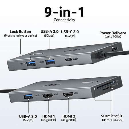 Model: Acer USB C Docking Station Dual Monitor With 2 HDMI, 9-IN-1 Laptop Docking Station with 4K HDMI, USB A&C 3.0, SD/Micro SD, 100W PD Charging, USB C Dock Compatible with Acer/Dell XPS/HP/Mac/Surface etc