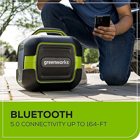 •Wirelessly connect to other Greenworks Bluetooth speakers (sold separately) to play music simultaneously
