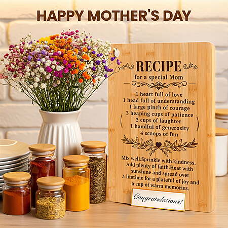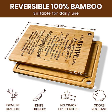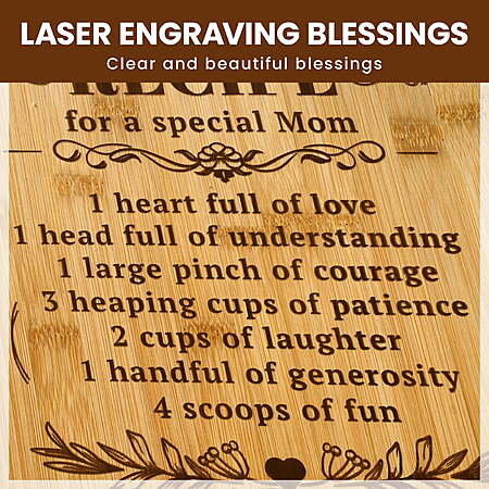 | Product Description: | KIKCOIN Cutting Board, Carved Gift Cutting Board for Mom, Mother’s Day, Thanksgiving, Christmas – Recipe for a Special Mom The Perfect Kitchen Gift-This is an ideal gift for various occasions such as birthdays, Mother’s Day, Thanksgiving, housewarming parties, weddings, bachelor/bachelorette parties, anniversaries, or Christmas. It is perfect for family members, parents, spouses, siblings, grandparents, home cooks, friends, neighbors, and culinary enthusiasts. Material and Quality-Made from 100% sustainable bamboo, this product is both durable and aesthetically pleasing. It is easy to clean and maintain, has a moderate size and weight, offers excellent cutting performance, and is gentle on your knives. Juice Groove-one side of the cutting board is a good wish carved by laser, the other side is a classic bamboo cutting board style with a juice groove, which can effectively prevent food juices from overflowing. Mother Day's Gift-Celebrate your mother’s passion for cooking and her enduring warmth and care with a thoughtfully crafted chopping board from Kikcoin. Designed with a minimalist aesthetic and engraved with heartfelt blessings, these cutting boards make a meaningful and lasting gift she will treasure for years to come. Home Decorations-These beautifully crafted cutting boards are perfect for kitchen use and home decor, making them an excellent choice for Mother's Day gifts. They bring a touch of elegance to any cooking space. |