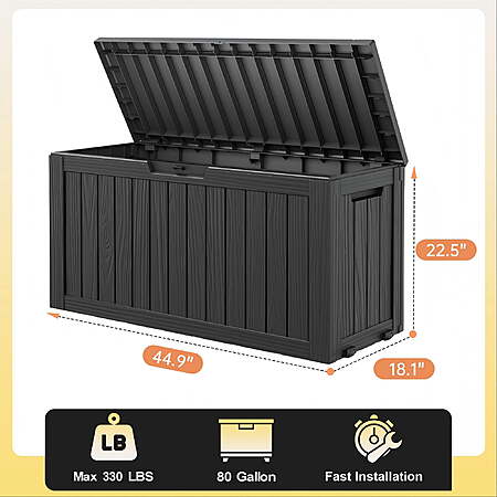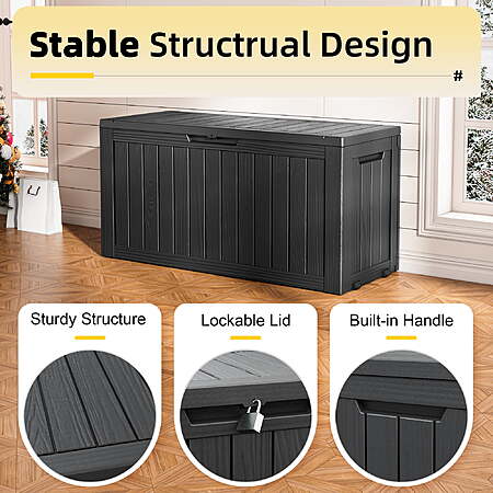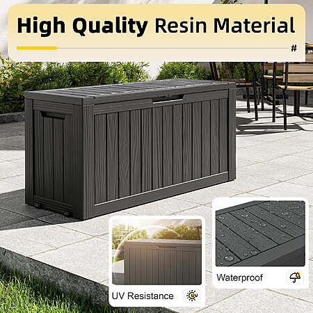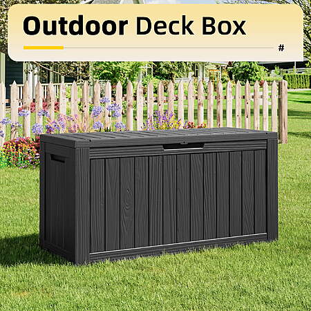 | Product Description: | Bifanuo 80-Gallon Resin Deck Box – Your go-to storage solution for a tidy outdoor space. Made of tough, waterproof resin, this large box has a lockable lid to keep patio cushions, garden tools, pool supplies, and seasonal items safe from rain, sun, and dust. Its textured design fits right in on your deck or patio. Roomy inside, it stores everything neatly and within easy reach. Durable and easy to care for, this box helps you clear away outdoor clutter for good. Versatile All-in-One Solution: This spacious box cleverly serves as a secure storage unit for cushions, tools, and pool toys, a comfortable patio seat or footstool, and even a stable side table — all in one piece. Built for All Weather: Constructed from heavy-duty, waterproof and UV-resistant resin with a wood-grain finish, it withstands sun, rain, and wind without fading, rusting, or warping. It's built to last with zero maintenance. Secure & Easy to Use: The lockable lid (lock not included) keeps contents safe and dry. Built-in side handles make it easy to move even when full, and the tool-free, snap-together assembly takes just minutes for one person. Massive Yet Sturdy Capacity: With a generous 80-gallon (300L) capacity and a robust design that supports up to 330 lbs, it effortlessly holds all your bulky seasonal items while maintaining a compact footprint. |