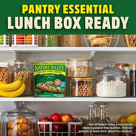 - Pack Nature Valley Lunch Box Chewy Granola Bars, the snack that's peanut free and made in a peanut free facility.* Every Double Chocolate flavor granola bar brings you Nature Valley goodness and a delicious taste. Each serving provides 8g whole grain (*At least 48g recommend daily), without artificial flavors, artificial colors, or high fructose corn syrup. Kids will love the irresistible taste of whole grain oats, milk chocolate, and chocolate chunks. Parents can feel good about serving a wholesome snack. Enjoy a Nature Valley Lunch Box Bar as a tasty addition to your pantry, an after school treat at home, a quick bite on the go, and more.