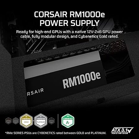 Model: CORSAIR RM1000e ATX 3.1 PCIe 5.1 Ready Fully Modular 1000W Power Supply – 12V-2x6 Cable Included Cybenetics Gold Efficiency 105°C-Rated Capacitors Modern Standby Mode – Black