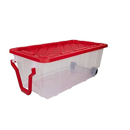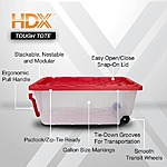 This heavy-duty HDX 40 gal. Tough Tote with Handle and Wheels is designed to for all your storage needs. The recessed lid enables you to stack multiple units effortlessly, while the tapered design facilitates easy nesting when you need to store them. With a sturdy clear base crafted from high-grade resin and a red snap lid, your items are safe and protected. Ideal for the thorough organizer seeking top-tier storage solutions, this tote features integrated slots for locking to deter unwanted access and handle for the comfort of pulling while transporting. Its unique tie-down channels also make it easy to secure for hassle-free transport and it's compatible with most hitch mounted cargo carriers. So that you can easily recognize what size your tote is, the gallon size is clearly visible on both the base and the lid. Embrace the essence of organized living with HDX Tough Totes.