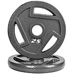 FlexWave Cast Iron Weight Plates, 2" Center Hole, Pair Set with 3-Grip Handles, Gray Rust-Resistant Finish Solid Cast Iron Build-Made from high-density cast iron, each weight plate pair delivers long-lasting strength and consistent balance. The 2-inch center hole fits standard Olympic barbells and compatible dumbbell handles for secure loading. Rust-Resistant Gray Finish-Finished with a durable gray coating that helps resist rust, corrosion, and surface wear. The coating is specially treated to remain odor-free, keeping your training space clean and comfortable. 3-Grip Easy Handling Design-Features three wide grip openings with textured accents for safer lifting and smooth plate changes. Clear pound and kilogram markings allow quick weight identification during workouts. Multi-Purpose Training Use-Suitable for strength training, conditioning, balance work, and functional exercises. Designed for use in home gyms, garages, and commercial fitness environments. Multiple Weight Pair Options-ffered in paired weight selections from 2.5 lb to 25 lb, making it easy to adjust resistance as training intensity and fitness goals progress.