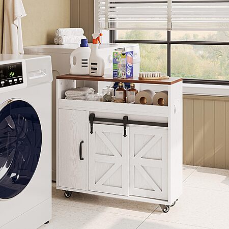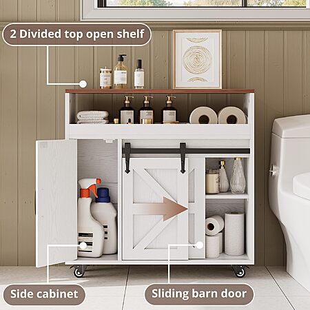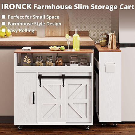 Amazon.com has IRONCK Toilet Paper Cabinet, Slim Bathroom Cabinet with 4 Rolling Wheels, Farmhouse Slim Storage Cart with Paper Holes, Sliding Doors and Adjustable Shelf for Small Space, White/Walnut on sale for $69.56. Shipping is Free.