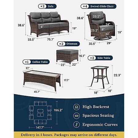 HILLGA Luxury Patio Furniture Set with 6-inch Thick Cushion, Outdoor Couch and High Back Swivel Rocker Patio Chairs, 11PCS Wicker Conversation Set , Dark Grey (V2) $2779