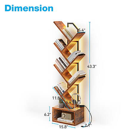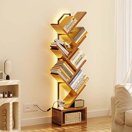 | Product Description: | Bring personality and function to your small space with this modern corner bookshelf featuring a built-in smart LED light strip. Perfect for teens and adults, this tree-shaped bookcase offers six tiers of open storage for books, CDs, or collectibles. The compact footprint fits easily into any corner, while the customizable APP-controlled lights with sound sync add a playful or cozy touch to your living room, bedroom, or home office. Made with durable MDF and a metal frame, it resists scratches and moisture. A perfect space-saving bookshelf that’s both stylish and functional. Customizable LED Lighting – Built-in RGB smart light strip with 6,000+ color options, APP & remote control, and sound-sync modes for creating ambient effects for reading, parties, or holidays. Stylish Space-Saving Design – This narrow bookshelf covers only 0.8 sq ft, fits tight corners, and features a modern tree shape that brings charm to any small living area or entryway. Sturdy & Multi-Purpose Storage – Made with a metal frame and MDF boards, each shelf holds 5–10 books. Ideal for books, games, manga, decorations, and speakers with additional bottom space for storage bins. |
