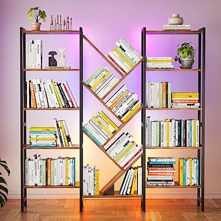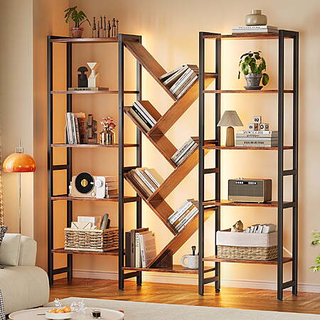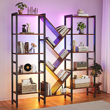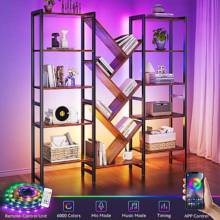 | Product Description: | Designed for young adults and families who value both function and ambiance, this triple 5-tier bookshelf features 17 open shelves and built-in RGB LED light strips controlled via an app. With over 6000 color options and music sync mode, you can easily create the perfect atmosphere for reading, gaming, or relaxing. Its artistic tree design maximizes storage space while adding a modern rustic charm to any living room, bedroom, or home office. Constructed with a durable metal frame, X-shaped brackets, adjustable feet, and an anti-tipping kit, this large bookcase ensures superior stability and safety. The rustic brown wood finish complements any décor, while the waterproof surface makes cleaning simple. Easy to assemble with numbered parts, this LED bookshelf combines practicality, style, and creativity in one statement piece. Smart LED Lighting – App-controlled RGB lights with 6000+ colors and music sync mode add ambience and fun. Large Tree Design Storage – 17 open shelves provide spacious storage for books, décor, and collectibles. Sturdy & Safe Build – Metal frame, X-brackets, adjustable feet, and anti-tipping kit ensure durability and stability. |