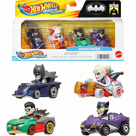 - Add some characters to Hot Wheels track play with a Hot Wheels RacerVerse 4-Pack! Each of these vehicles features a non-removable character from popular movies, comics and television in the driver's seat of a themed 1:64 scale die-cast car. Each vehicle is optimized for use on Hot Wheels tracks, and with four vehicles in the set, the racing starts right out of the box. Makes a great gift for collectors and kids 3 years old and older. Colors and decorations may vary.