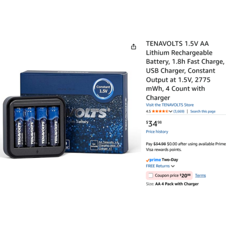 TENAVOLTS 1.5V AA Lithium Rechargeable Battery, 1.8h Fast Charge, USB Charger, 2775 mWh, 4 Count w/Charger. YMMV - Coupon Price $20.98