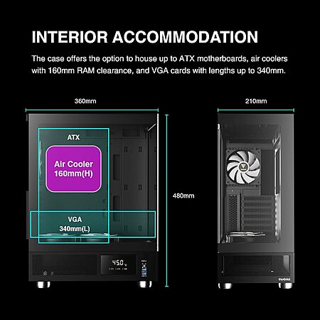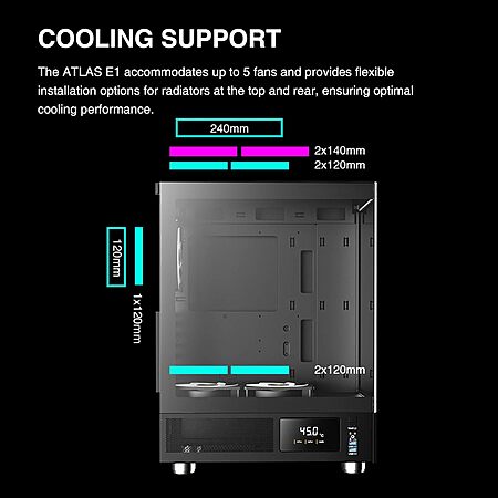 Model: Gamdias ATLAS E1, CPU GPU temp screen, tank with mesh air flow, 3x ARGB 120mm fans, RGB 5v 3pin sync, tempered glass, ATX, MATX, ITX
