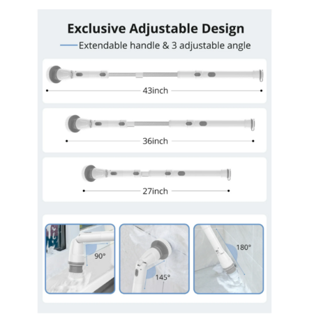 【Freely Adjustable】 The electric shower scrubber is equipped with extendable and detachable stainless-steel handle(27、36、43inches), and 3 adjustable angles for brush heads(90°、135°、180°), easy to clean hard-to-reach places, without kneeling or bending over. Care for your waist and joints, save time and effort.