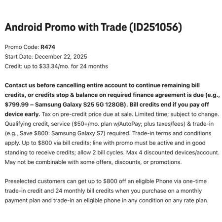 Contact us before cancelling entire account to continue remaining bill credits, or credits stop & balance on required finance agreement is due (e.g., $799.99 – Samsung Galaxy S25 5G 128GB). Bill credits end if you pay off device early. Tax on pre-credit price due at sale. Limited time; subject to change. Qualifying credit, service ($50+/mo. plan w/AutoPay; plus taxes/fees) & trade-in (e.g., Save $800: Samsung Galaxy S7) required. Trade-in terms and conditions apply. Up to $800 via bill credits; line with promo must be active and in good standing to receive credits; allow 2 bill cycles. Max 4 discounted devices/account. May not be combinable with some offers, discounts, or promotions.