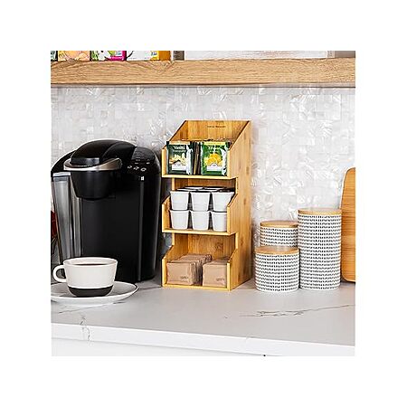 - Effortless Organization: This condiment holder offers an easily accessible solution for sorting condiments, coffee pods, tea bags, cups, stirrers, and more. Its stacked sectional design minimizes countertop footprint, ensuring everything stays tidy